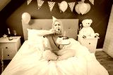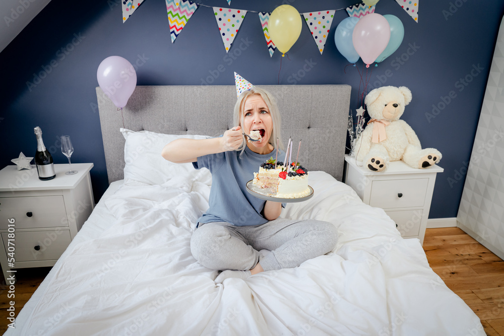 Sad, upset woman in pajama and party cap eating by spoon her birthday cake sitting on the bed in decorated bedroom. Celebrates birthday alone. Jamming of negative emotions. Selective focus.