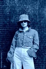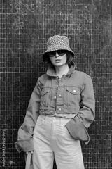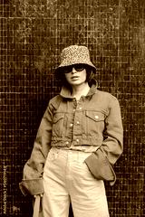 Hipster fashion young woman in bright clothes, sun glasses and bucket hat posing on the green tile wall background. Urban city street fashion. Vertical card. Selective focus. Copy space.