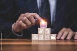 insurance concept, Property (family house) insurance protection concept. Insurance agent complete wooden model of the house with last piece with text insurance.