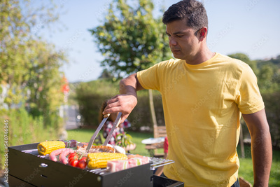Focused mid adult man grilling steak and corn. Dark-haired man in yellow T-shirt turning meat on BBQ grid. BBQ, cooking, food concept