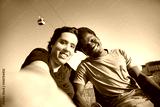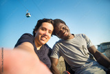 Smiling biracial couple taking selfie on embankment. African American man and Caucasian woman in wheelchairs on embankment, looking at camera. Love, relationship, social media concept