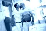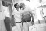 Portrait of African American gay couple kissing outdoors. Two happy men walking in street after buying clothes in boutique enjoying life. LGBT couples relations and clothes for men concept