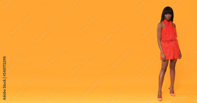 Professional fashion model in red dress.