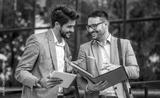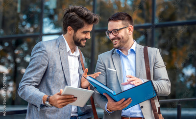 Conversation about projects. Business people in front of the corporation. Business, lifestyle concept