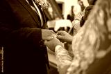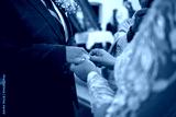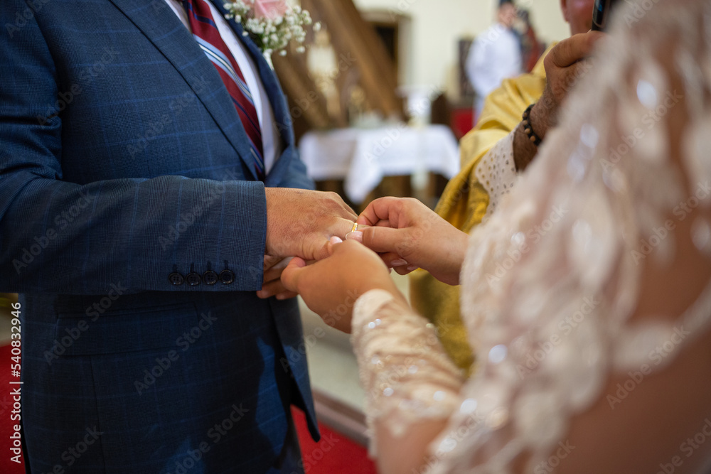 Panna Młoda zakłada pierścionek na palec. The bride puts the ring on her finger.