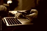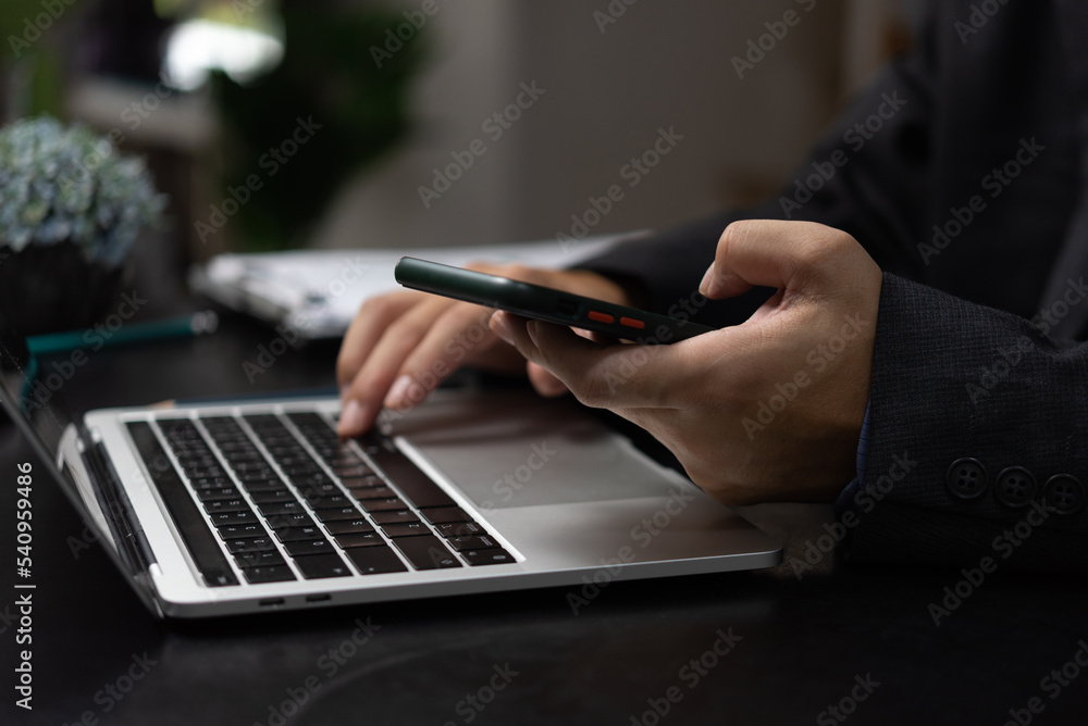 Man with mobile smartphone in his hands and using keyboard laptop. Modern digital technology concept.Freelancer at work.Working from home.