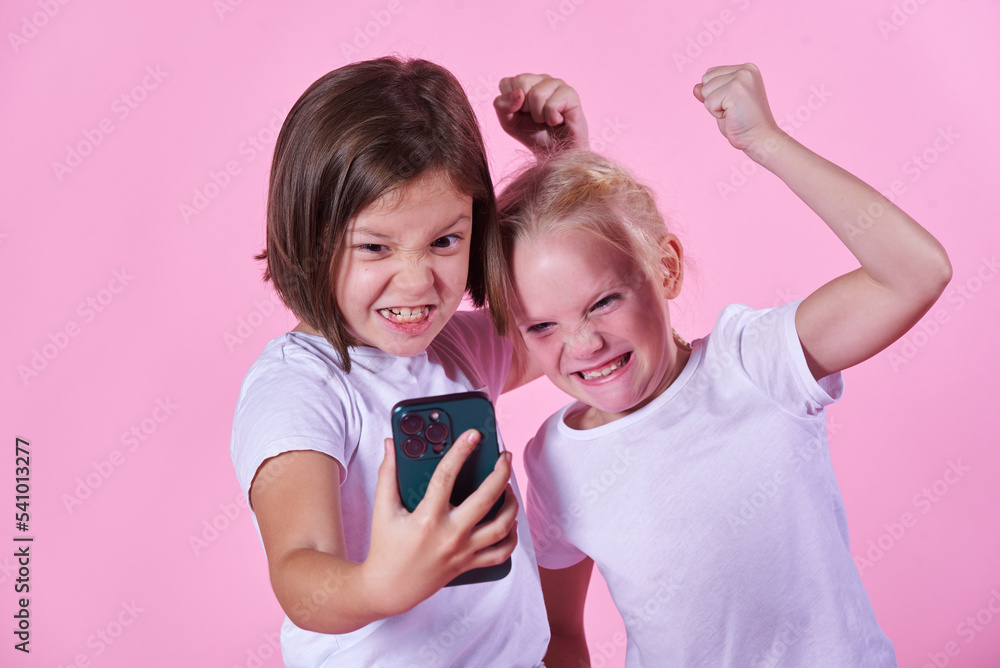 Furious little girls, two angry friends shouting at a phone, angry with what they see