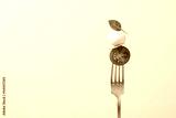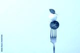 Fork with tomato, mozzarella cheese and basil. Caprese salad on fork close up view. Italian food concept