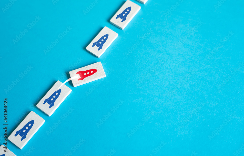 Startup rocket takes off to success. Successful business start. High performance and sales. Breakthrough technology, fintech Innovation. Stand out from others. Business unicorn. Breaking new ground