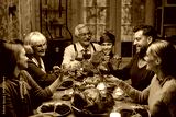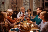 Happy extended family toasting while celebrating Thanksgiving at dining table.