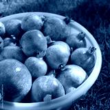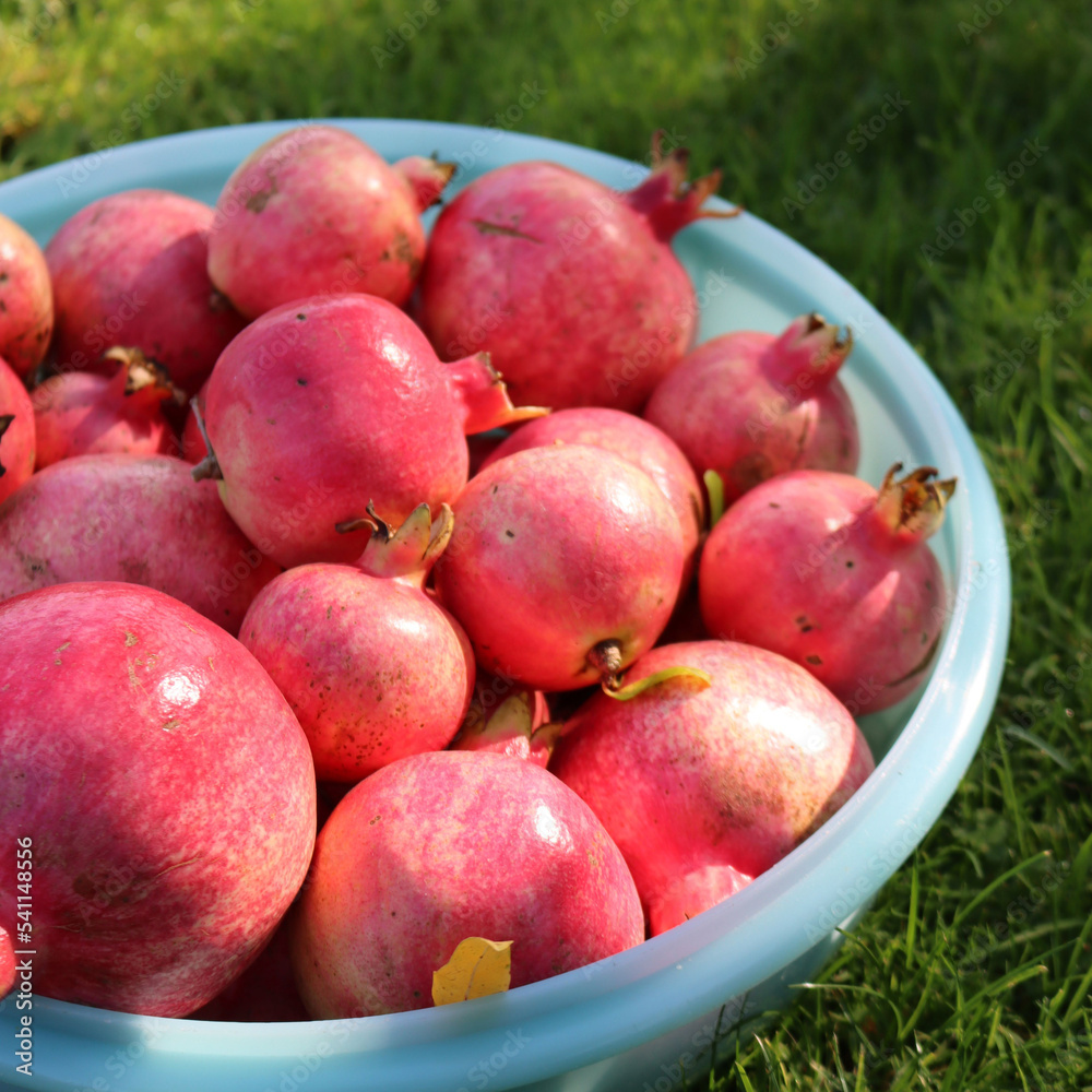 Many ripe red Pomegranate fruits in plastic bowl on a green meadow. Punica granatum harvest on a sunny day