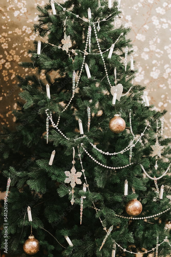 christmas and new year time. christmas tree decorated in vintage retro style with balloons, snowflakes, candles and garlands of beads. green fir or spruce. winter holiday season at home