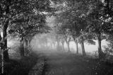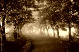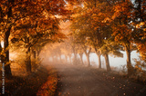 Autumn forest road leaves fall in ground landscape on autumnal background. Colorful foliage in the park. Falling leaves. Autumn trees in the fog
