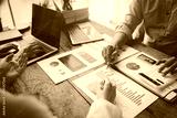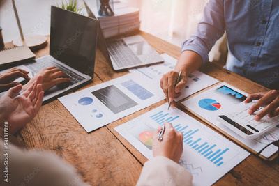 Financial analyst analyzes business finance reports on laptop and graph documents during corporate meeting discussions showing successful teamwork, business meeting ideas, marketing.