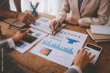 Financial analyst analyzes business finance reports on laptop and graph documents during corporate meeting discussions showing successful teamwork, business meeting ideas, marketing.