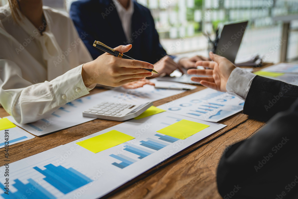 Teamwork with business people consultant describes a marketing plan to set business strategies. business budget planning and business research concept, Negotiation, Analysis, Discussion