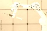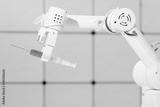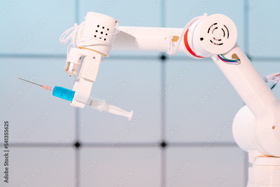 Robot hand with a medical syringe. Future medicine concept using robots and artificial intelligence