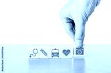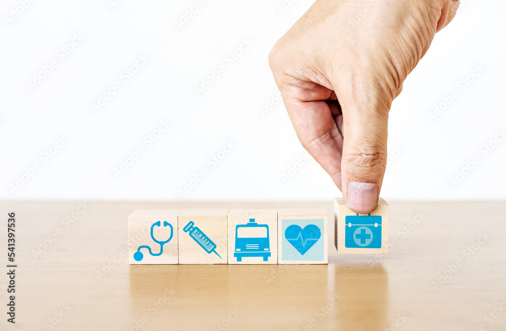 Hand arranging wood block stacking with the medical icon for healthcare and Health insurance management concept
