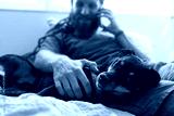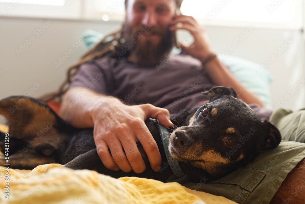 A bearded rastafarian hippie man petting his dog while talking on the phone, laying in his bed