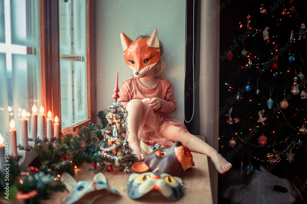 Cute little girl is dressing up a tiny Christmas tree and trying on New Year's animal masks. Image with selective focus and toning.