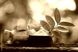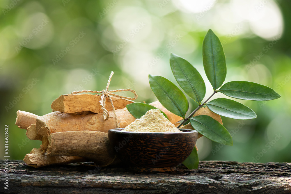 Eurycoma longifolia Jack,dried roots,green leaves and powder on nature background.
