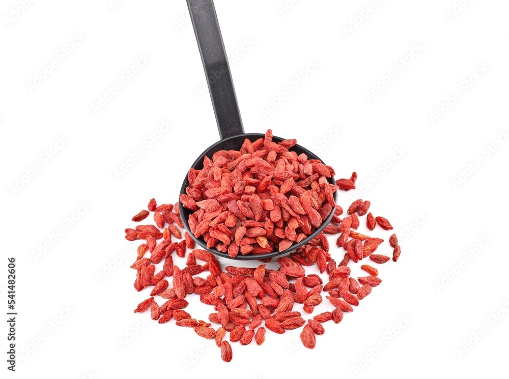 Dried goji berries, or wolfberry, in a large round black spoon on white background.