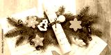 Note sheets with Christmas decor, fir branches and cookies on grunge background