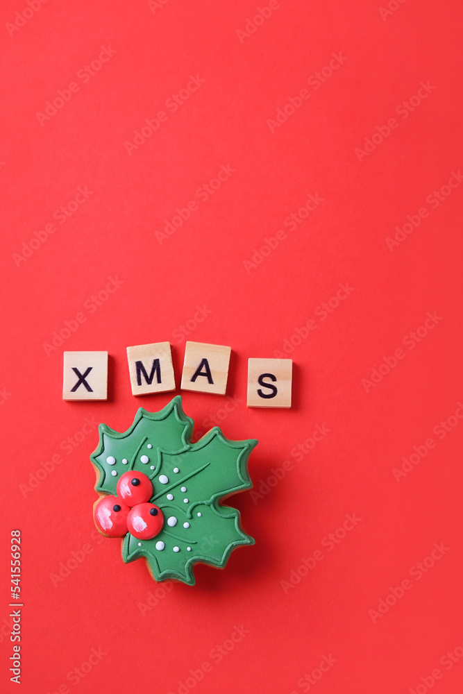 Christmas gingerbread holly leaf shaped cookie and wooden letters "xmas" on red background close up. symbol of Christmas holiday, Advent Festive winter season. minimal style. top view