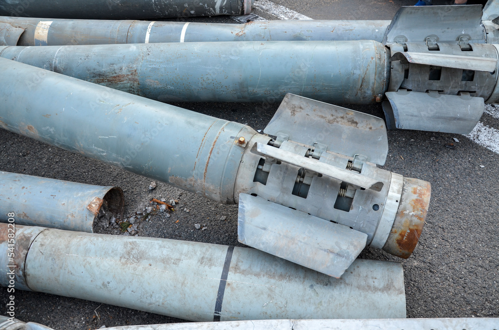 Missiles from the multiple-launch rocket system displayed at Khreshchatyk street in Kyiv during an exhibition of destroyed russian military equipment