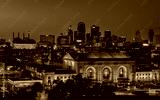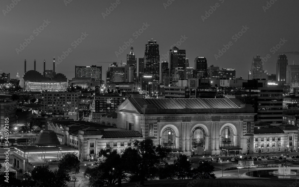 black and white photo of Kansas City at night