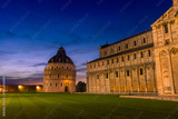 Beautiful night view of Campo dei Miracoli square with the Baptistery and the Cathedral of Pisa, Italy