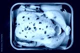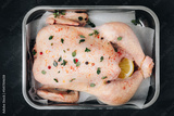 Chicken. Whole fresh raw free range chicken with spices on dark background, ready to cook, top view