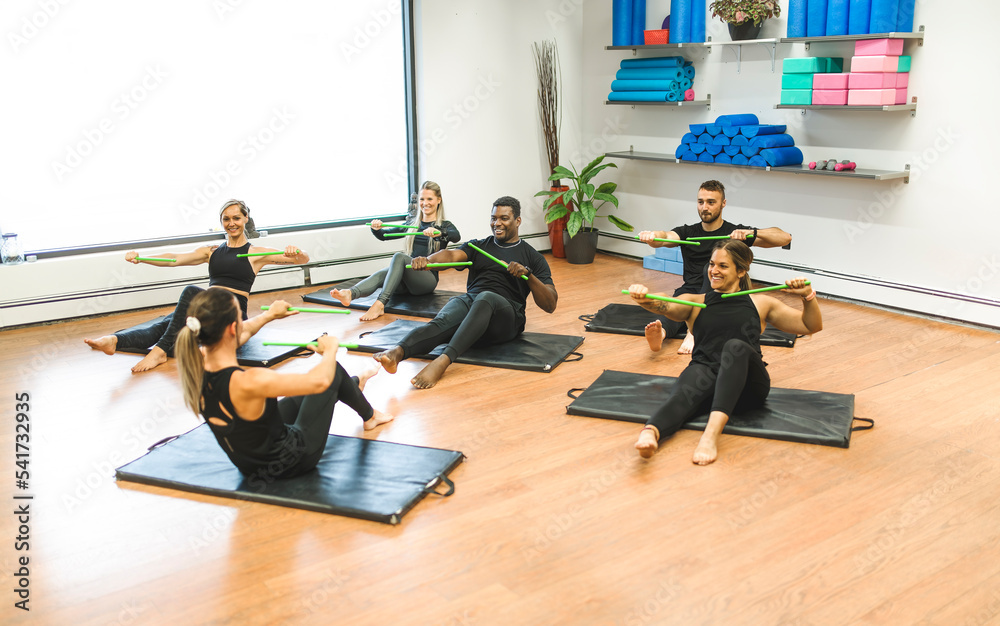 Fitness Teachers with Green Drum Stick at the gym with a training group of peole