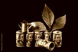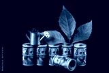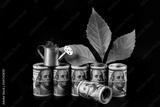 Miniature watering can with 1 cent coins, 100 american dollar bills and autumn leaves on a black background