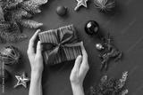 Christmas concept. First person top view photo of female hands holding red giftbox with bow over green gold red baubles star deer ornaments mistletoe fir branches in snow on isolated green background