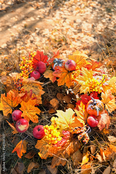 autumn decor of leaves, pumpkins and apples in garden, abstract natural background. Beautiful Festive decoration for Thanksgiving holiday, Mabon, Halloween party. Fall harvest season