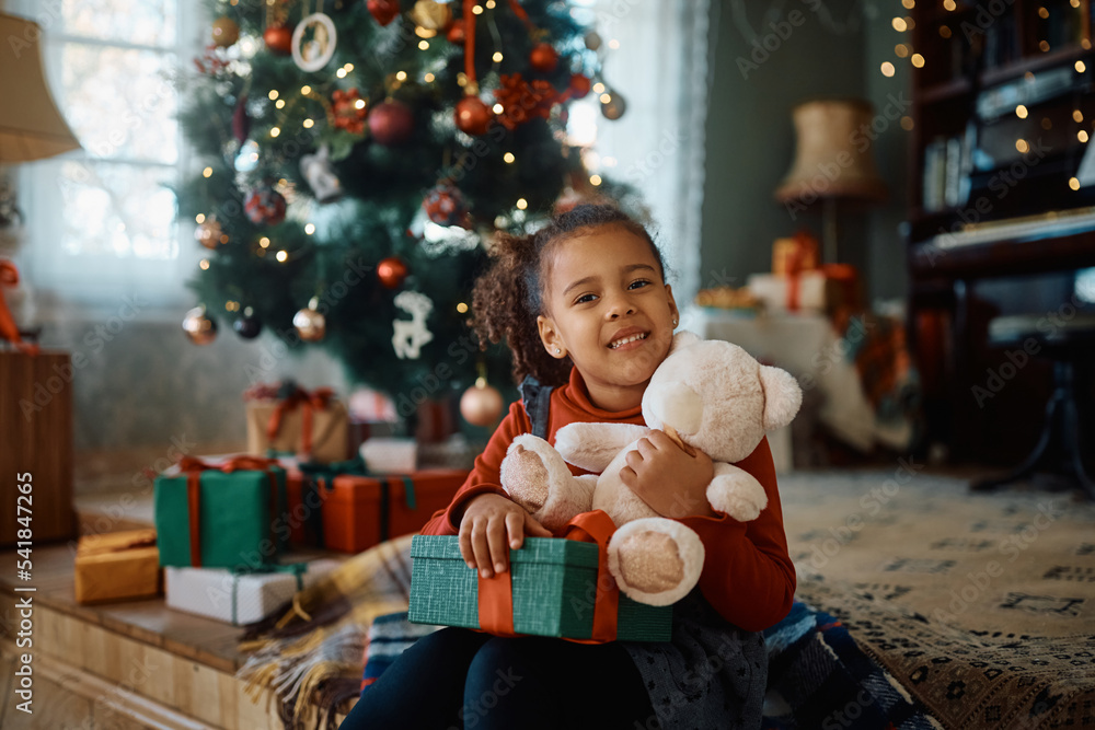 Smiling black girl with Christmas present and teddy bear on Christmas day at home.