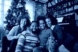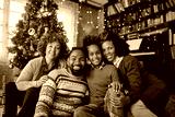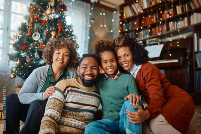 Portrait of happy black extended family on Christmas day at home looking at camera.