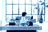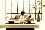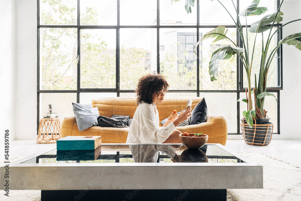 African american female sitting floor browsing through social media while eating a strawberry in a big bright apartment