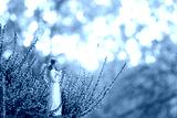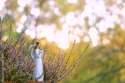 angel figure and heather flowers close up on sunny abstract blurred natural background. Beautiful seasonal garden scene. Religious church holiday. symbol of faith in God, christianity. autumn season