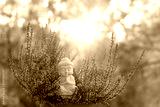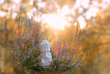 Buddha statue and heather flowers close up, abstract blurred sunny natural background. autumn season. esoteric spiritual practice, Relax time, harmony, meditation, life balance concept.