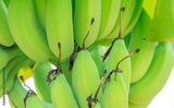 Closeup bunch of raw green cultivated bananas in the banana garden. Cultivated banana plantation. Tropical fruit farm. Herbal plant for treating diarrhea and gastritis. Agriculture farm. Organic food.