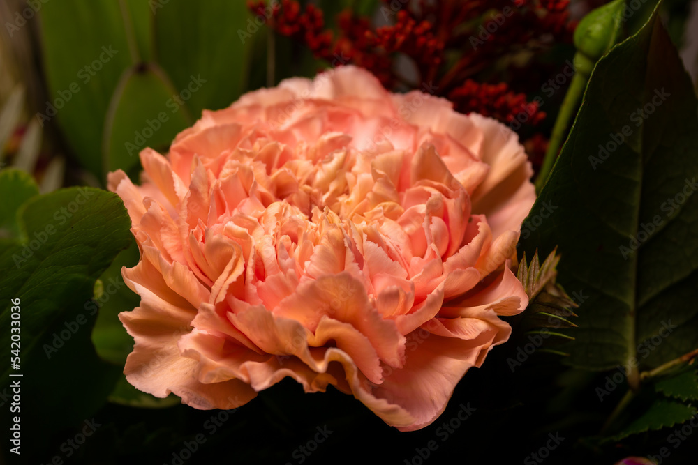 Abstract macro texture view of a single pink and white carnation (dianthus) flower in an indoor florist arrangement