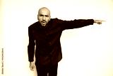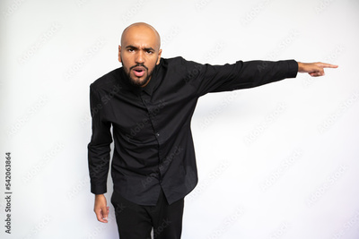 Portrait of angry young man pointing at ads. Confused Latin American male model with bald head and beard in black shirt looking at camera, bending and pointing right. Advertisement concept