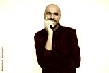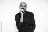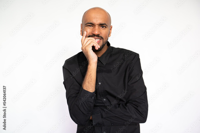 Portrait of curious young businessman looking at camera against white background. Young bearded man wearing black shirt smiling expressing admiration. Curiosity and admiration concept