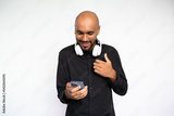 Portrait of happy young man with headphones using smartphone. Bearded businessman wearing black shirt reading or texting message. Mobile technology concept