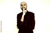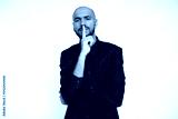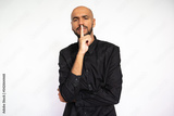 Portrait of confident young man standing with finger on lip against white background. Young bearded businessman wearing black shirt making silence or secret gesture. Secret concept