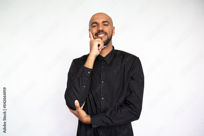 Portrait of attentive young man leaning on hand. Happy Latin American male model with bald head and beard in black shirt looking at camera, smiling. Contemplation, focus concept