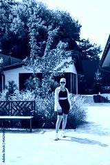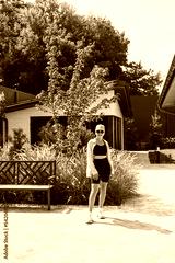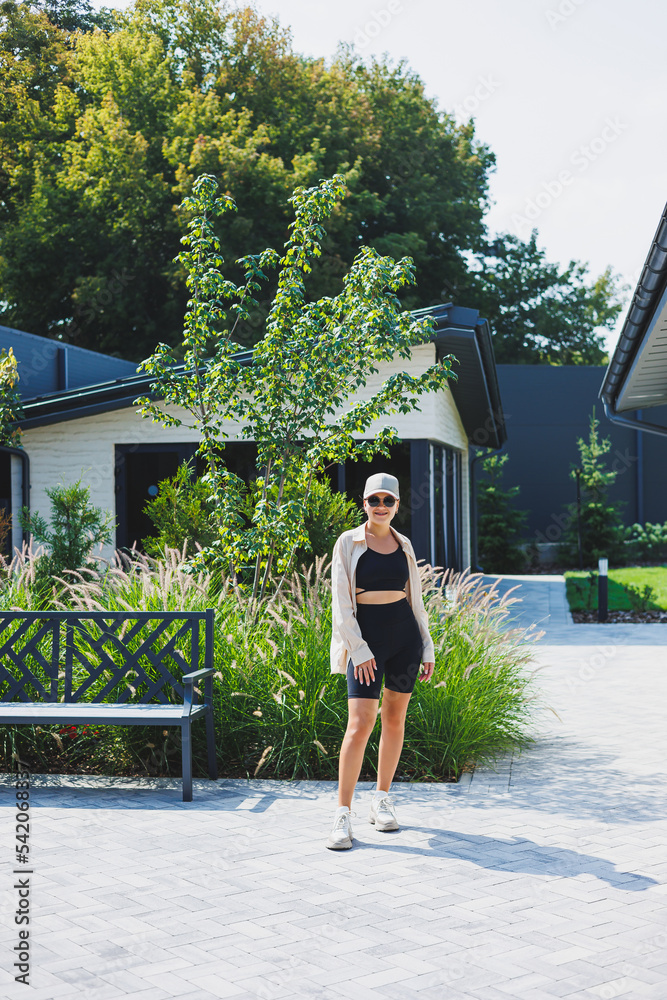 Slim young stylish woman in a black top and shorts, wearing an oversized jacket. A stylish girl walks down the street. stylish summer fashion outfit. sunglasses,