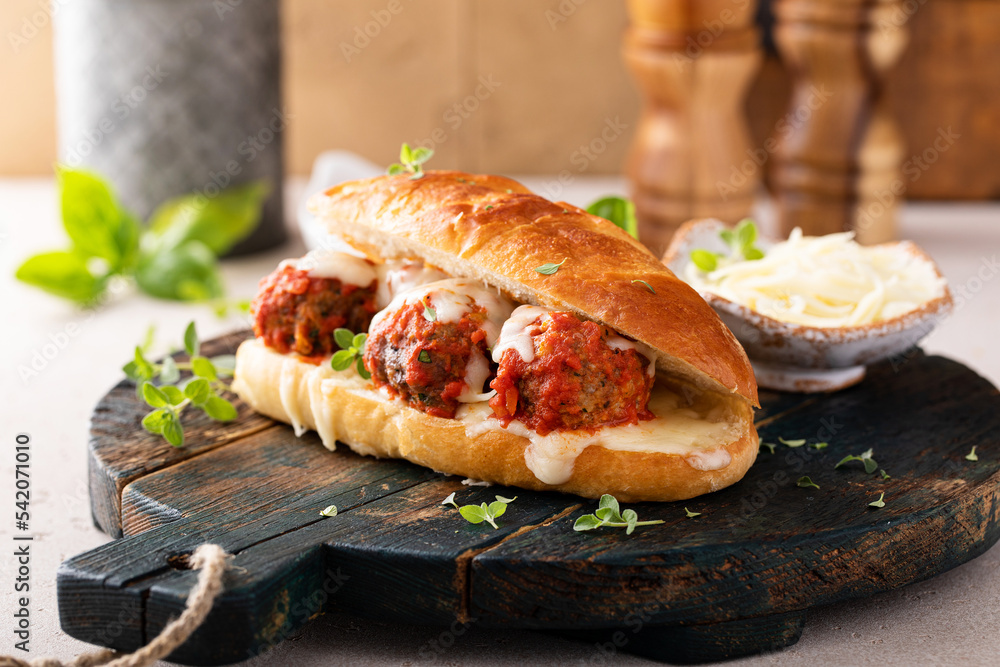 Meatball sub sandwich with marinara and mozzarella